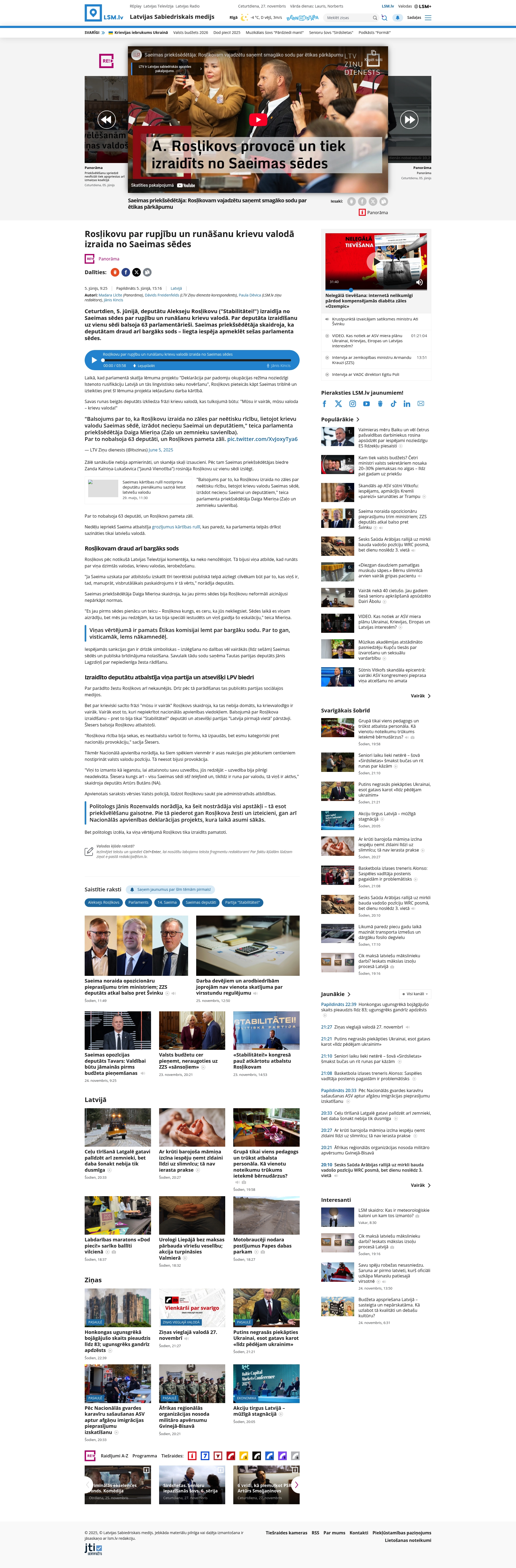 On June 5, 2025, Latvian MP Aleksejs Rosļikovs from the Stabilitātei! party was expelled from a Saeima (Latvian parliament) session due to rude behavior and speaking Russian. The speaker of the Saeima explained that several warnings were given to Rosļikovs, but due to persistent disruption and breaches of parliamentary ethics, expulsion with a potential fine was warranted. This incident is linked to ongoing tensions regarding language use and parliamentary conduct in Latvia. Rosļikovs has expressed willingness to accept a fine, while parliamentary ethics commission chair Dace Mirka confirmed the procedural handling. Political reactions include calls for decorum and adherence to parliamentary rules.