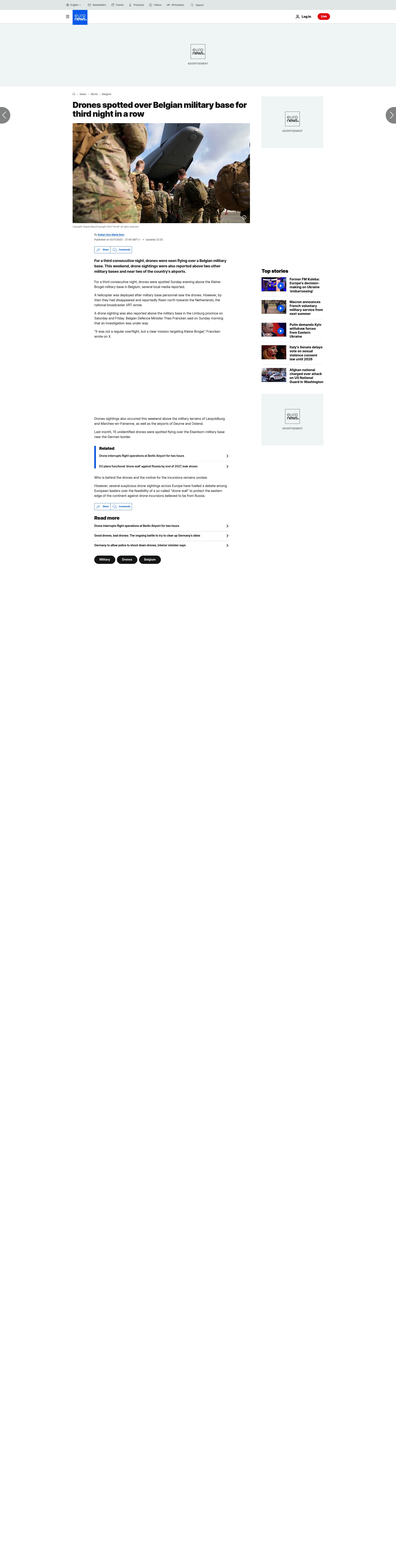 Drones have been detected flying over a Belgian military base for the third consecutive night. The persistent drone sightings have raised security concerns among military officials. Authorities are investigating the nature and intent of these drone activities, as the intrusion poses a potential threat to the security of the base. No immediate damage or casualties have been reported. Efforts are underway to enhance surveillance and defensive measures at the military facility.
